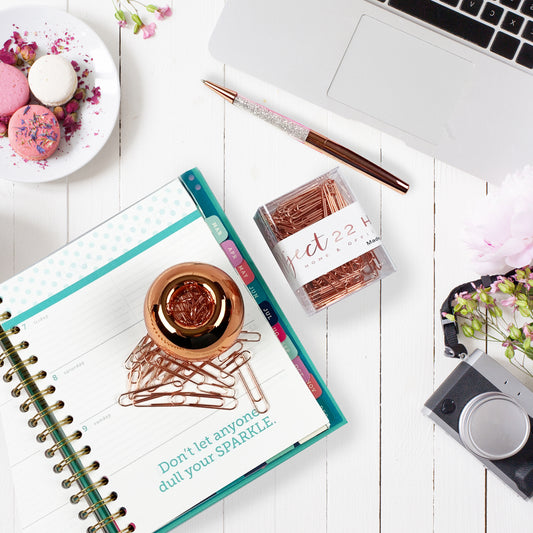 PROJECT22 Rose Gold Office Desk Accessory Bundle | Round Paper Clip Holder with Magnetic Lid, 170 Assorted Rose Gold Paperclips with Clip Storage Box and Rose Gold Crystal Ballpoint Pen