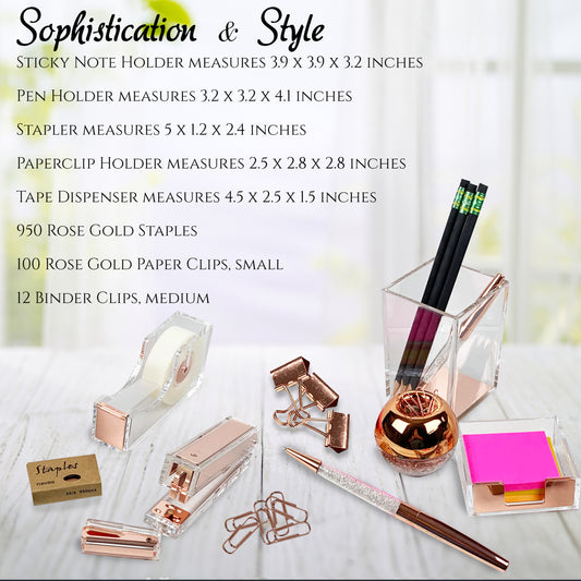 Project22 Home Rose Gold Office Desk Accessory Set | Stapler, Tape Dispenser, Binder Clips, Stapler with Staples and Remover, Sticky Note Holder, Pen Cup, Paperclips with Clip Dispenser